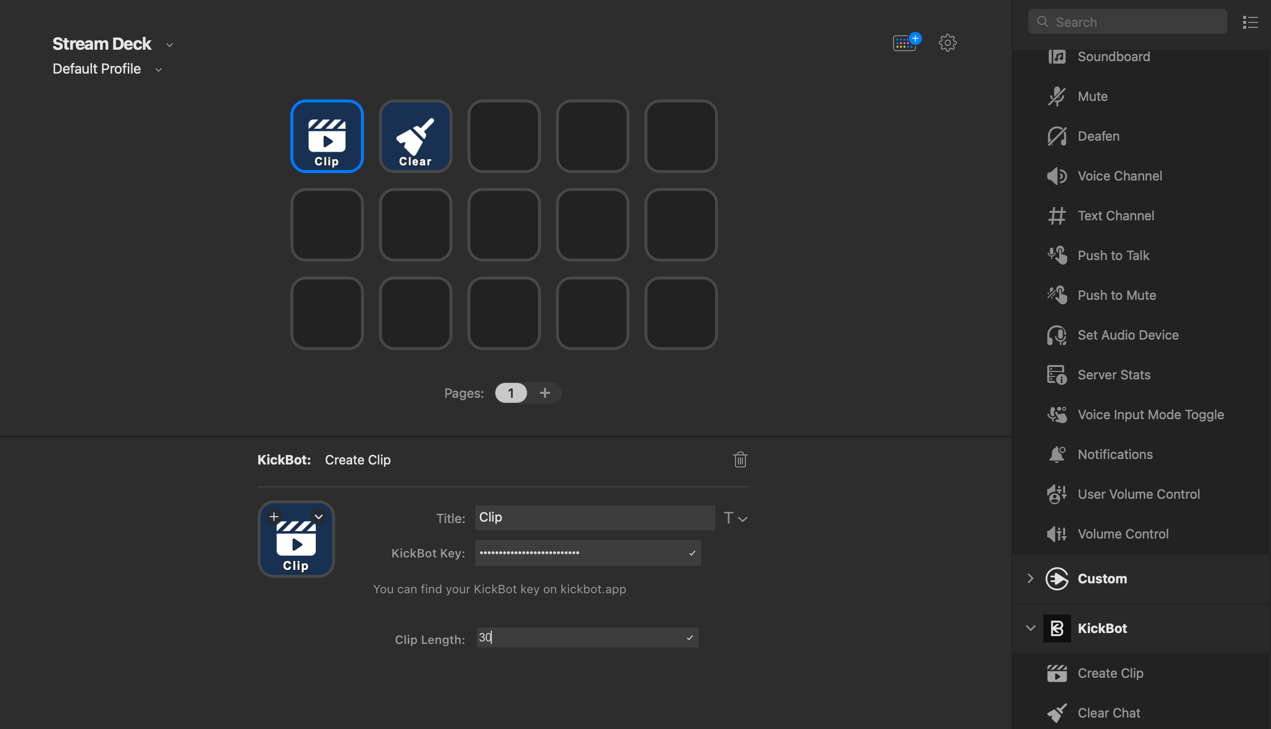 Paste the key found in the KickBot settings page into the "KickBot Key" box, some actions may also have additional settings. Do note, if you are using the clip action make sure you have enabled the !clip command on KickBot. Learn more about the !clip command [here](https://docs.kickbot.com/dashboard/chat-bot/using-the-clip-command).
