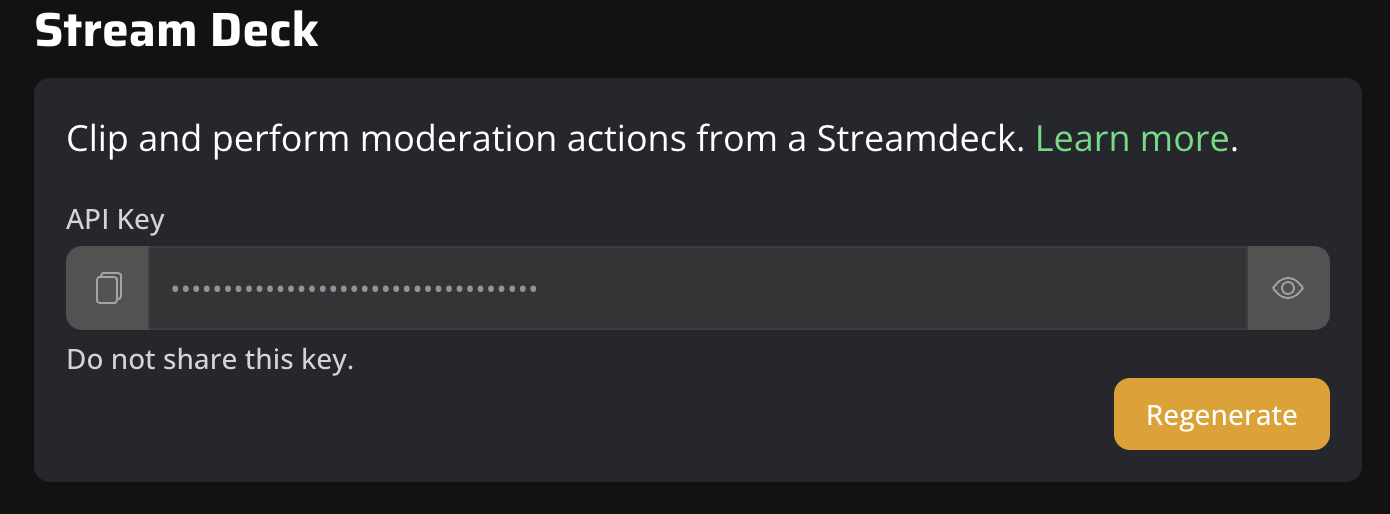 When verification is complete you will be able to access your KickBot Stream Deck key. This is used to connect the plugin to KickBot, make sure this key is kept secret as anyone with access will be able to use it. If it has been exposed you can regenerate the key, this will invalidate any old keys and give you a new key.