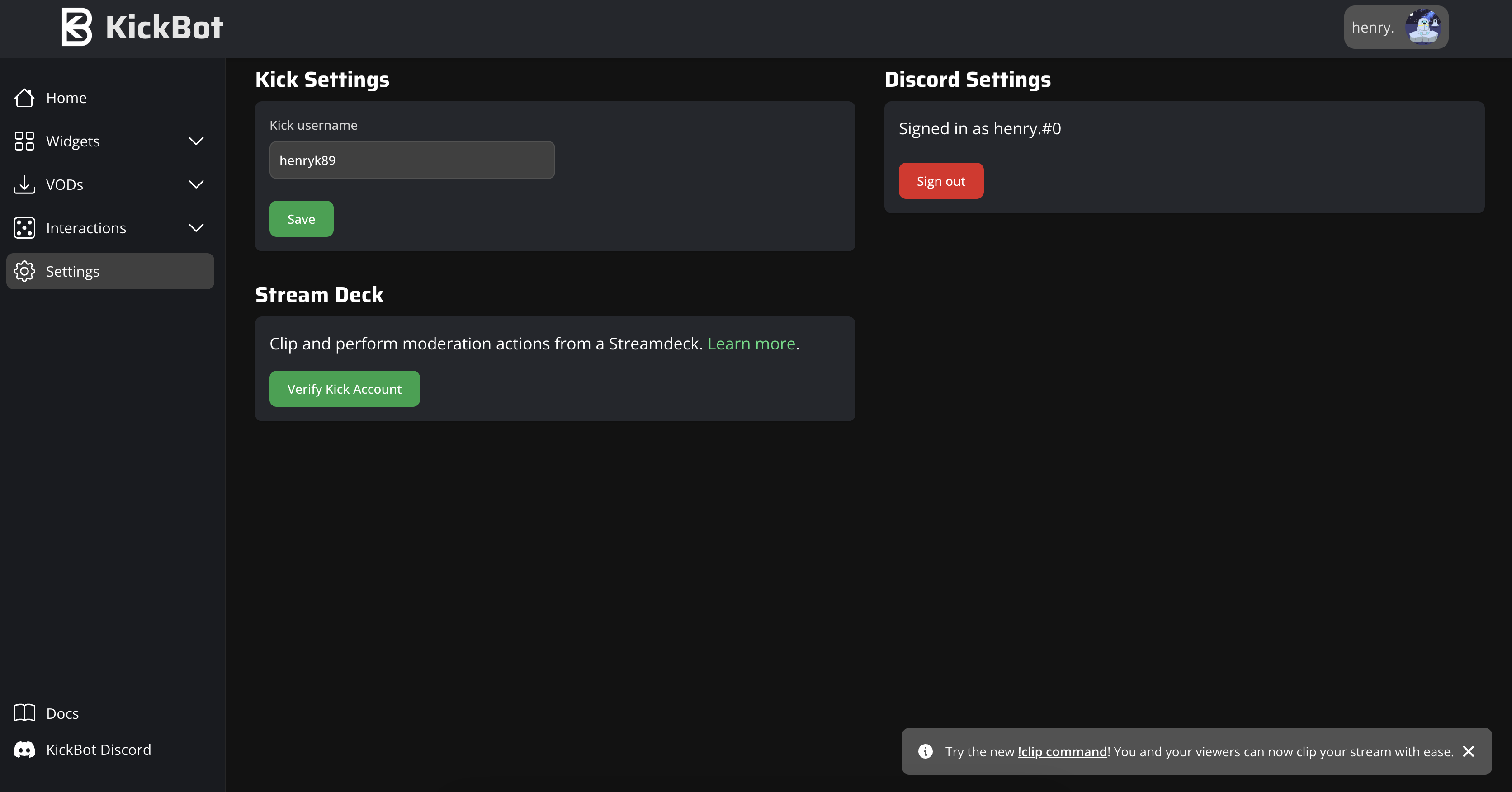 Once signed in, enter your Kick username in the KickBot settings. Make sure this exactly matches your Kick username. After it's saved, press "Verify Kick Account" in the Stream Deck box and follow the instructions in the prompt.