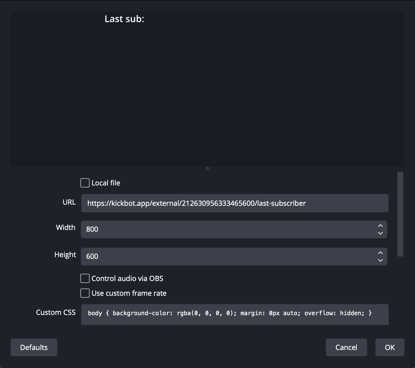 Inside the browser source settings, paste the widget URL you copied from KickBot into the "URL" field. There's typically no need to adjust any other browser source settings, but if necessary, you can modify the width and height values to resize the chat widget.